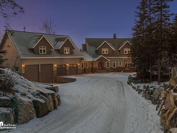 Magnificent, indeed: you'll be enamored with this stunning, custom 5-star energy rated Roseberry Ridge home on 2.67 acres. Serene, safe, surrounded by fantastic schools, yet only 5 minutes from downtown Eagle River. It's an easy 25 minute commute to midtown Anchorage, with privately maintained road access. Vaulted living space with in floor heating is open to the nicely appointed ... kitchen including granite countertops, custom cabinets and maple accents throughout. Separate 2 bedroom, 2 bathroom mother-in-law/caretaker/guest suite/B&B above the garage. Smartly designed for the outdoorsman with additional laundry room, spacious mud room, "man cave" and a four bay shop/RV garage and half bath. Family-friendly features include walk-through pantry between garage and kitchen, home theater, media room, and cozy family room. Enough outside parking for multiple trailers and toys. Heated sidewalks, indoor/outdoor whole home sound system, low-maintenance turf and south facing decks with incredible views of the inlet to enjoy while listening to the sound of the creek that runs through the property. Photos simply can't capture this home's Alaskan character and charm!