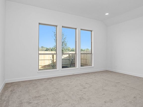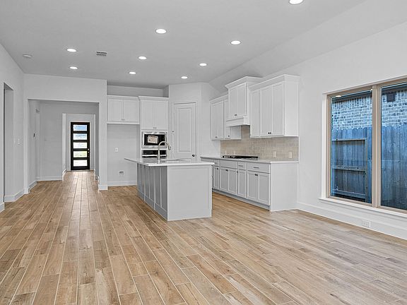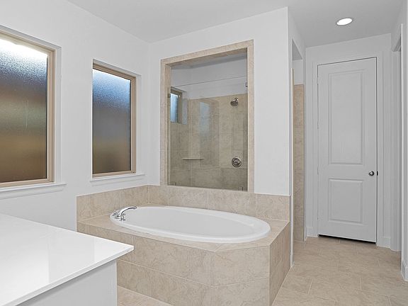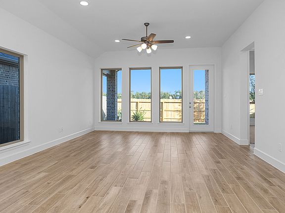 Extended entry with 12-foot ceiling leads to open kitchen, dining area and family room with 10-foot ceilings throughout. Kitchen features a 5-burner gas cooktop, corner walk-in pantry and generous island with built-in seating space. Family room features wall of windows. Primary suite with 10-foot ceiling and wall of windows. Dual vanities, garden tub, separate glass-enclosed shower and large walk-in closet in primary bath. A Hollywood bathroom connects to bedrooms three and four. All bedrooms feature walk-in closets. Covered backyard patio. Mud room off two-car garage. Representative Images. Features and specifications may vary by community.