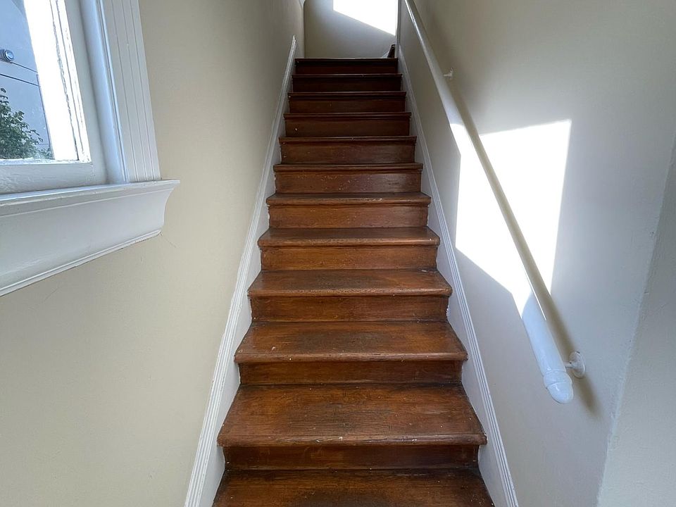 Sunny, spacious top floor 4 bedroom, 2 bath apartment in a well-kept, retro-cool duplex. Fantastic central Berkeley location, tucked into a sweet tree-lined street just one block from University Avenue and 4 blocks from the Berkeley Campus. Stellar central Berkeley location. Quick, easy access to nearly anywhere you'd like to go: the Sunday farmer's market, Cal Campus, Trader Joe's, Ohlone park, the Gourmet Ghetto, Berkeley BART, you name it - it's all just a few blocks away! Unit A is the top floor of the front house on the property. The front door leads up a flight of stairs to the main living level. The top of the stairs opens up into a large open living area and kitchen. There are warm hardwood floors throughout the unit, and this large living area has built-in shelving and cabinets. Four large bedrooms surround the living area. All four rooms are sun drenched and boast plenty of closet space. One room has its own full bath. The unit also has a dedicated covered parking spot in the back of the property. Owner pays for trash. Tenants are responsible for PGE, water, and the internet. Sorry, no pets allowed. Available now. Showing by appointment only. Please call or email to set up a time and give us some information about you!