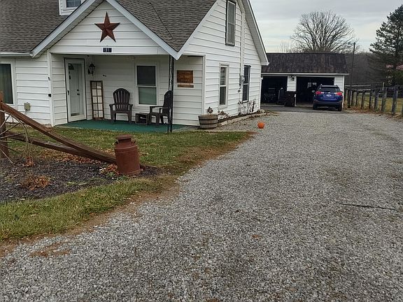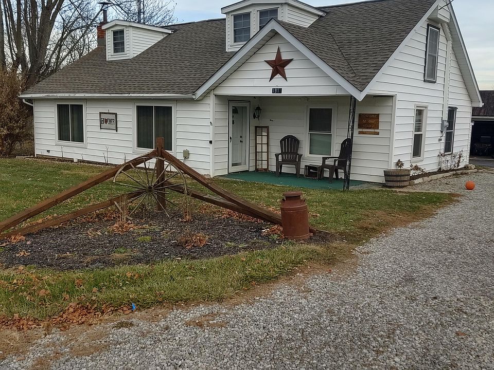 Country living with easy access to I-71 exit. If your are looking for space--including storage space, look no further! This large farmhouse boasts a spacious living room with new carpet, built-in shelving, and wood-burning stove. Tons of cabinets and c