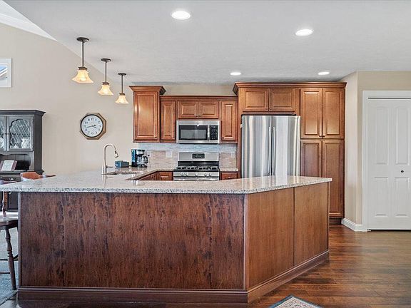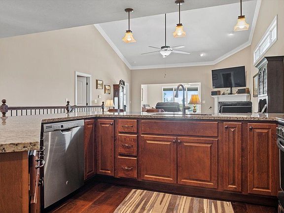 Beautiful brick 3 bedroom - 3 full bath ranch on the golf course. Open floor plan with cathedral ceilings throughout main living area. Great golf course & sunset views from the Florida/Sun room. Third bedroom & full bathroom in finished basement. Laundry hookups on both floors. Very efficient home with Andersen casement low E windows & extra blown insulation. Yard is professionally landscaped with irrigation system. Subdivision features community building with fitness & activity rooms as well as an outdoor pool.