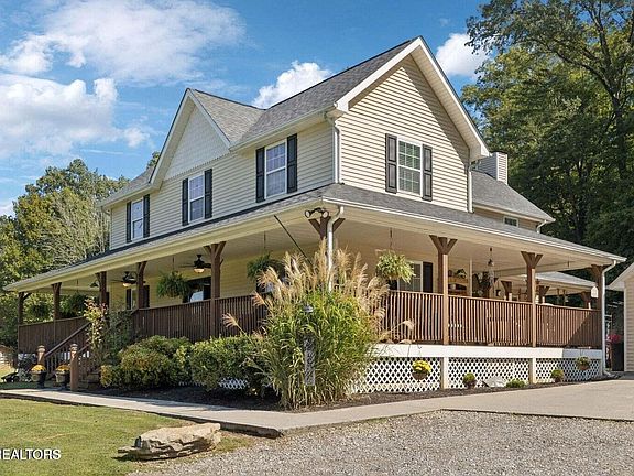 'Welcome Homestead'' Almost 8 Acres of unrestricted land in between Knoxville and Sevierville; 2960 sq ft home enhanced with a 3/4 wrap around porch; its own spring water with 3 spring fed ponds stocked; small barn; portion cleared with more if need be to expand your pasture for your future homestead. The fiberglass pool with a surround patio awaits your floats. Entering this farmstyle home you are greeted to hardwood flooring; vaulted ceilings; a bedroom on main floor with a living area flowing into the kitchen area offers 3 tone custom maple cabinetry; granite counter tops; composite granite double sink; newer appliances; and a center island; laundry is conveniently located for life ease. Sweeping upstairs on hardwood flooring, there are 3 updated bedrooms including a large master suite area. New roof in 2020; new tankless water heater in 2024; one new heating/cooling unit installed in 2024. There is also a separate septic system with another electric pole for another home. Property is ready for your small farm and peace. 36 miles to Dollywood and University of Tennessee is 25 miles from this oasis of peace. ''Come On Homestead'' Buyer to verify information before making an informed offer.