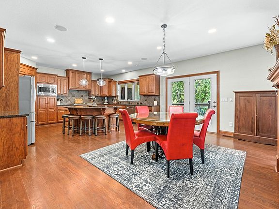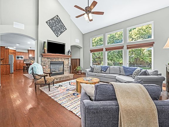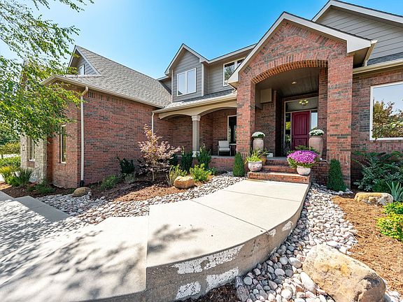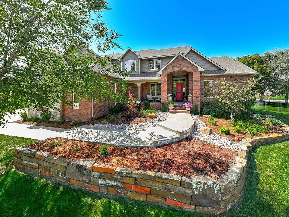 Welcome Home! This exceptional 7-bed, 6-bath, 1-1/2 story home offers luxury living with thoughtful design throughout. Situated perfectly on nearly an acre lot in the coveted estates addition of Reeds Cove, The Pointe, the attractive curb appeal and beautiful landscaping make this front elevation a showstopper. Large covered front porch with room for seating brings you to the home's grand 2-story entrance and that features high ceilings, large windows, abundance of natural light, rich hardwood flooring, custom window treatments, formal dining room, open kitchen with breakfast nook, custom cabinetry, granite countertops, walk-in pantry, double ovens, sink at the window, 2-way fireplace shared with hearth room and great room, kitchen door leading to the large and low maintenance covered deck complete with ceiling fan, tv mount and party lights. A large laundry room with a laundry chute from the upper level and mud room and a 1/2 bathroom are conveniently located on the main level as well. The primary bedroom features an ensuite bathroom with jetted tub, 2 sink vanities, full tile shower with dual shower heads, water closet and a walk-in closet also located on the main level. The upper level includes three generous sized bedrooms, one with its own ensuite bath and an additional hall bath with a dual sink vanity, plus a large bonus room that could be a game room, playroom, or study. The walk-out basement has a spacious family room with a cozy fireplace, space for a game table, wet bar with full size refrigerator and THREE additional bedrooms with another full bathroom. A highlight and huge value of this home is the oversized, heated SIX car, side-load garage seamlessly attached to the house. The "shop" spanning 35.5’ x 29’ is a versatile space that can technically fit 4 cars is ideal for hobbies, workshop, or storage. Features of this space include fully finished walls and high ceilings, half-bath for added convenience, SW corner has thicker reinforced concrete to support an auto lift, 400-amp electrical power service, custom framed attic for additional storage, paved frontage for additional parking and ease of access. Having this type of garage or workshop attached to the home and all conveniently located in town is priceless! This is connected to the 2-car side load garage as well. And that's not all, step into your very own private backyard oasis! This huge outdoor space features a large stone-paved patio with a built-in fire pit and seating, ideal for relaxing or entertaining. Over 60 mature trees provide a fully shaded backyard in the summertime, while the spacious layout and fully fenced yard offer privacy and plenty of room to enjoy outdoor activities. The custom-built, integrated treehouse and playset truly makes this a place to be enjoyed by all ages! This is absolutely one of the best backyards in town! Irrigation well and sprinklers help maintain the extensive landscaping. Freshly painted and caulked exterior Fall of 2024 and new TAMKO Heritage 50-year composite roof and gutters new in 2019. Two water heaters and a dual-zone HVAC system ensure comfort and energy efficiency year-round. Enjoy the amazing neighborhood amenities including a fully stocked pond, jogging path, playground, swimming pool and club house. Conveniently located close to Hwy 96 makes getting anywhere quick and easy. Sedgwick County Taxes and Andover Schools, this home truly has all that you’ve been looking for and more, don’t miss it!