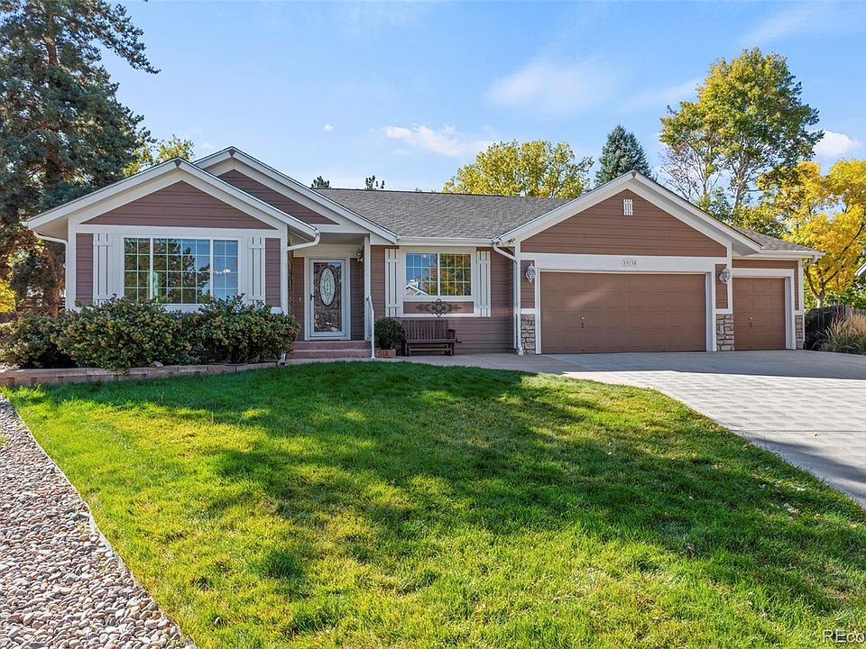 Welcome to your new ranch home in Parker's Stroh Ranch neighborhood! This floorplan is open and has plenty of room for all of your needs, including an unfinished basement with egress windows and expansive family room that opens to the backyard, deck and walking trails. This property is located on a quiet cul-de-sac and a two minute walk to the community clubhouse, pools, fitness center and park. This one checks all of the boxes! 3-car garage, tons of storage and is move-in ready. Entry and main hallway, kitchen and family room have beautiful oak wood floors in great condition. New carpet and freshly painted!!!