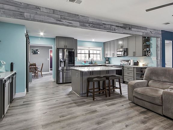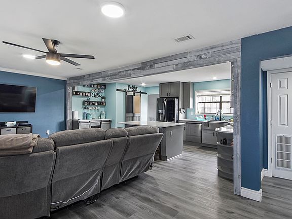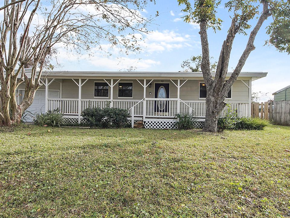 CENTRALLY LOCATED HOME WITH A CHARMING ROCKING CHAIR STYLE FRONT PORCH! The interior features 3 bedrooms, 2 full baths, an open floor plan with split bedrooms, ample natural light, crown molding, new vinyl plank flooring, an interior laundry room and a single car garage. The NEW kitchen boasts ample counter and cabinet space, beautiful Quartz tops, new black stainless appliances, a breakfast bar, a coffee bar and a large pantry with barn doors. The master bedroom can accommodate most king size furniture and has an adjoining bath with walk-in tiled shower with a 3 faucet shower system (including a rain shower head), a large vanity, and an XL walk-in closet. The exterior features a 75x135 lot, a back deck for grilling and entertaining, an XL covered front porch and a privacy fenced backyard