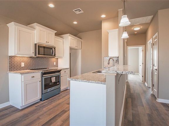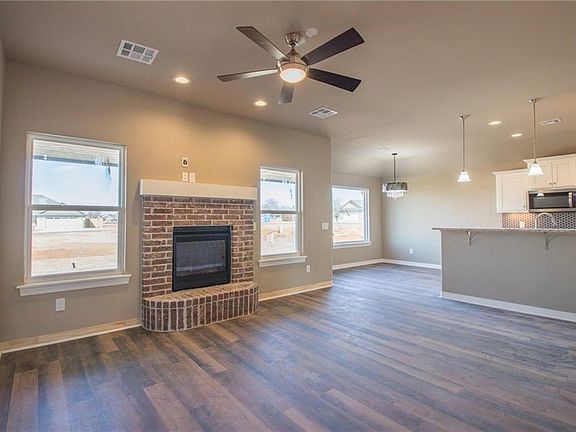 Spectacular new home with beautiful finishes throughout in The Timbers. Modern styled construction with an enchanting front porch to greet you. Upon stepping inside, the quality of construction is apparent. This living room is spacious with a charming brick fireplace as the focal point. Its easy to fall in love with the kitchen! Corner sink, granite counter tops, painted cabinetry, pantry, stainless steel appliances, and under counter lighting will make this the perfect new space for your family. Kitchen opens up to living with a dining area for that coveted "open floorplan" feel. Master suite offers dual sinks, oversized shower and two large walk in closets flanking either side of an inviting soaker bathtub. Extras include LED lighting and faux wood blinds throughout home. Covered patio for relaxing and entertaining family and friends. Privacy fence included. The Timbers has you surrounded with beautiful new homes and offers a neighborhood park in the community. Welcome home!