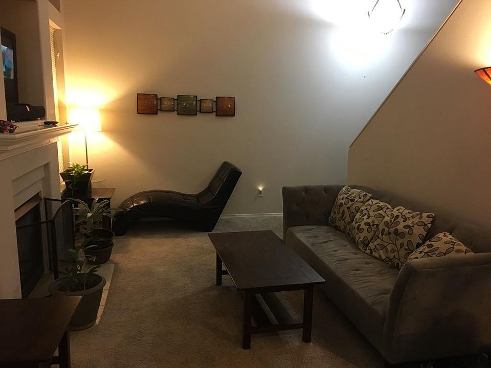 This is a great location and a great place. 2 bedrooms both with large closets (the master is a walk-in "California" closet both with en suite bathrooms. It has laundry with washer and dryer upstairs and a den downstairs. Vaulted ceilings and tons of storage both inside and in the large garage are great perks!