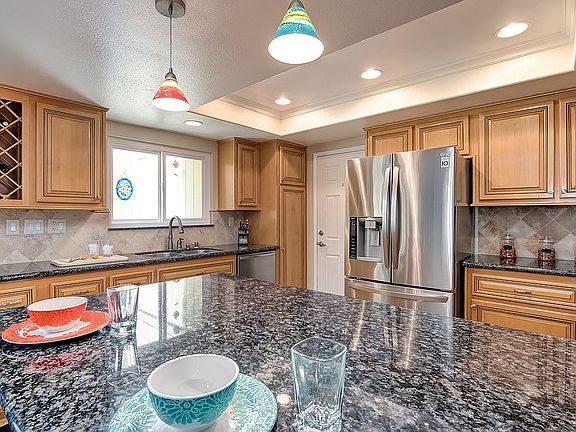 Completely stunning home from top to bottom with a modern feel. This beautiful home boasts three (4) large bedrooms, three (3) full bathrooms, a bedroom downstairs as well as three bedrooms upstairs. It also has a giant bonus room, perfect for a game room or playroom and upstairs laundry room. Large entertainers patio, off the dining room, with infinity doors perfect for entertaining family and friends who want that indoor/outdoor feel. There’s a rooftop deck with a decked out built in bbq and a hot tub. The deck has 360’ views, Mountain View’s on two sides and city views on the other two sides. All bedrooms have ceiling fans and recessed lighting. Home amenities include: two (2) car garage; dual-paned windows throughout; and a private front courtyard. The living room opens to the dining area and an elegantly appointed kitchen with upgraded cabinetry and dark granite countertops. Downstairs has travertine tile throughout, and upstairs has brand-new high-end carpeting. Freshly painted, this home has been well loved for years by its owners and had two (2) bathrooms remodeled last year. There is an extra large deck to view the fireworks and city lights. This ideal location near shopping, restaurants, and the new Pacific City, as well as a fabulous school district (K-12).