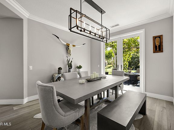 Modern Mediterranean curb appeal leads the way to this beautifully updated residence tucked away on a quiet cul-de-sac. The façade pairs smooth light gray stucco with crisp white trim, stacked stone planters, a sleek glass panel front door, and a driveway inset with turf, allowing ample parking. Inside, a grand foyer showcases a sweeping staircase with black iron balusters. Fresh interior paint, natural wood flooring on the main level, updated hardware, and recessed LED lighting give every space a refined feel. A downstairs bedroom with an en-suite bathroom is perfect for guests or a home office. The living room centers on a corner fireplace topped by a TV niche, while the adjacent great room is bright and comfortable with picture windows framing the backyard. The dining room features a modern rectangular chandelier and opens to the pergola, which is perfect for indoor/outdoor entertaining. The chef's kitchen is finished in timeless white cabinetry with Cristallo quartzite counters with an island, subway-style backsplash, pendant lighting, and premium stainless steel appliances, including a built-in refrigerator and double ovens. Upstairs, the serene primary suite is generously sized with plantation shutters and a designer ceiling fan. The doors and windows capture hillside vistas and natural light and, is the perfect place to sit and enjoy a drink or read a book. Upstairs offers three additional guest rooms and a loft/movie viewing room. Out back, a resort-size yard just under an acre delivers the California lifestyle: an expansive lawn, a sparkling pool with sun deck, a circular conversation/firepit area, and a shaded pavilion/pergola all set against open space for rare privacy and sunset views. The fenced yard offers an expansive grassy area perfect for pets. Extensive solar (owned free and clear) pairs with a Tesla Powerwall for energy efficiency and backup. Additional upgrades include a custom metal front door and new windows in the media room.