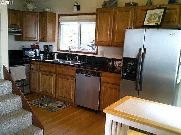 New hardwood floors and new paint on main level to be complete by 6/5/14! Rare find in the heart of Oceanside Village: privacy on wooded lot with ocean and Three Arch Rocks views from inside the home, deck & hot tub. Walk to the beach from this modern beauty with elegant stone fireplace, oak floors, double lofted bedrooms, remodeled kitchen. Must see!