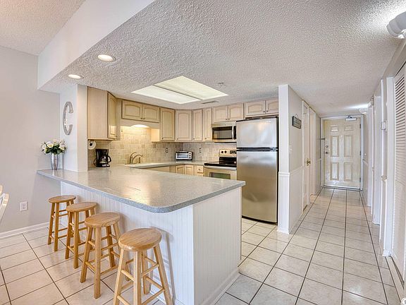 OPEN HOUSE ON SATURDAY, JULY 15TH FROM 12:00 - 2:00 AND SUNDAY, JULY 16TH FROM 11:00 - 2:00! All this beautiful unit needs is your toothbrush!. It has been updated since its original construction. It has tile flooring throughout. The bedroom tiles are gorgeous wood-look tiles. Newer cabinets and vanities replaced the originals. The kitchen has expansive solid surface countertops, tile backsplash and stainless steel appliances and both bathrooms have quartz countertops. Private spacious laundry room inside the unit is convenient for washing all your sandy towels after a day at the beach, which is just across the street. Great view of the pool from the roomy balcony off of the living room and master bedroom, with a peek-a-boo ocean view as well. Plenty of room for beach chairs, boogie boards and other outdoor items in your private outdoor storage closet. With under-building parking and an elevator, it provides easy access for bringing packages directly into the condo. Whether you've been pleasure shopping or grocery shopping, this feature certainly makes convenient. Bermuda Run is a meticulously maintained condo complex. The buildings have been freshly painted and the roofs have recently been replaced. Located in the Cherry Grove section of North Myrtle Beach, residents can walk across the street to the beach. You can easily enjoy the sun, sand, and ocean whenever you desire. Additionally, being close to Main Street offers even more opportunities for entertainment and excitement. The area hosts a variety of events and festivities throughout the year, such as the St. Patrick's Day parade and Shag Dance competitions. This vibrant location ensures that there's always something happening to engage residents and visitors alike. Furthermore, the condo's proximity to Barefoot Landing adds another layer of convenience. Barefoot Landing is a popular shopping and entertainment complex known for its charming shops, restaurants, and theaters. With it being just minutes away, you'll have easy access to a range of dining options, unique shopping experiences, and live performances. Lastly, the area is renowned for its world-class golf courses, making it a golfer's paradise. If you enjoy the sport, you'll have plenty of options to choose from. Additionally, the miles of beautiful shoreline in the area offer opportunities for beach walks, swimming, and various water activities. Units don't come available often here and when they do, they're gone quickly. Don't wait to see this one!