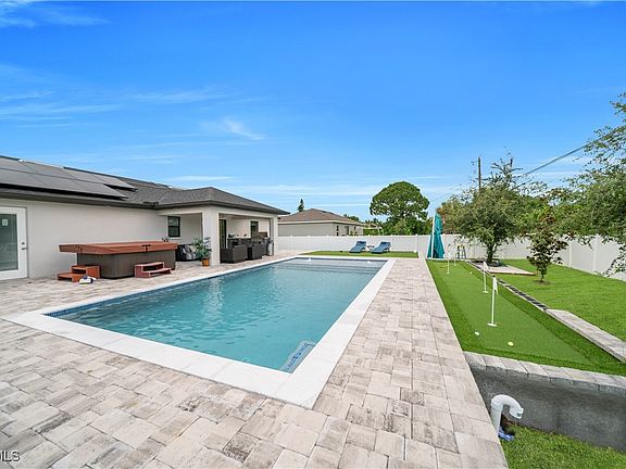 Welcome to your upgraded oasis! This beautifully enhanced single family home features an open concept living and dining area, ideal for hosting gatherings with friends and family, while the tile flooring throughout adds a touch of elegance and easy maintenance. The modern kitchen features sleek stainless-steel appliances, granite countertops, and ample cabinet space for all your culinary needs. Step outside to a stunning pool, private golf putting green, and a luxurious outdoor kitchen, perfect for relaxing and entertaining. Enjoy complete privacy in your backyard retreat. This home offers the perfect blend of comfort and style. Located in the desirable Cape Coral area, you'll have easy access to shopping, dining, entertainment, and beautiful beaches just a short drive away. Best of all, this home is fully solar-powered no electric bill and no water bill either! For added convenience, the owner covers lawn care and pool maintenance, ensuring a truly hassle-free lifestyle. Don't miss this rare opportunity to live maintenance-free in a stunning home! NO SECURITY DEPOSIT UP FRONT! MAY MAKE PAYMENTS IF NEEDED!