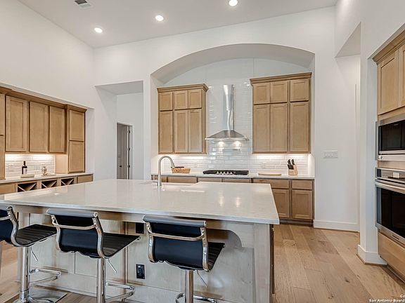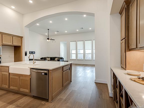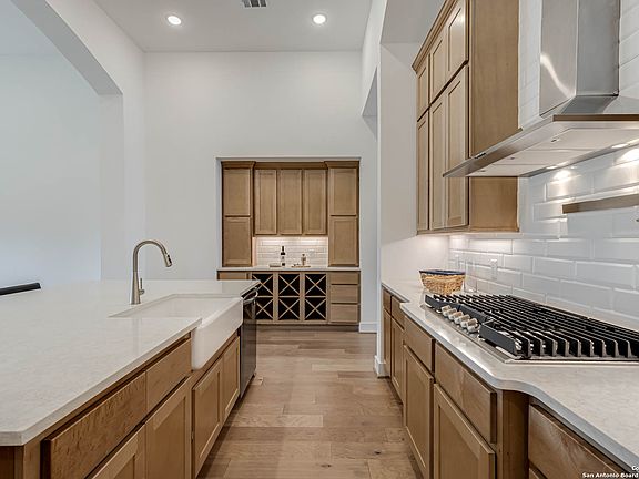 Welcome to this stunning 4-bedroom, 3.5-bath home located in the Veramendi Master Community, nestled in the heart of New Braunfels, Texas. Spanning nearly 2,800 sq. ft., this residence seamlessly blends modern luxury with comfort. The home features a thoughtfully designed floor plan that includes a secondary bedroom with an en-suite bath-perfect for guests or multi-generational living. Step into the heart of the home where an upgraded kitchen awaits, boasting an exposed vent hood, built-in appliances, and under-cabinet lighting. The custom hutch enhances storage and prep space, while maple buckskin shaker-style cabinets and lusso quartz countertops create an elegant, functional space. The apron-front sink adds a touch of farmhouse charm, making this kitchen a true showpiece. Enjoy rich wood flooring throughout the main living areas, with plush upgraded carpet in the bedrooms and high-quality tile in all bathrooms and the utility space. The primary suite is a serene retreat featuring upgraded white shaker-style cabinets, premium tile flooring, and stylish finishes. Outside, an extended living area invites you to relax and entertain while taking in the Texas evenings. This home is move-in ready and meticulously crafted with high-end upgrades throughout-don't miss your chance to make it yours. COME & BUY IT!