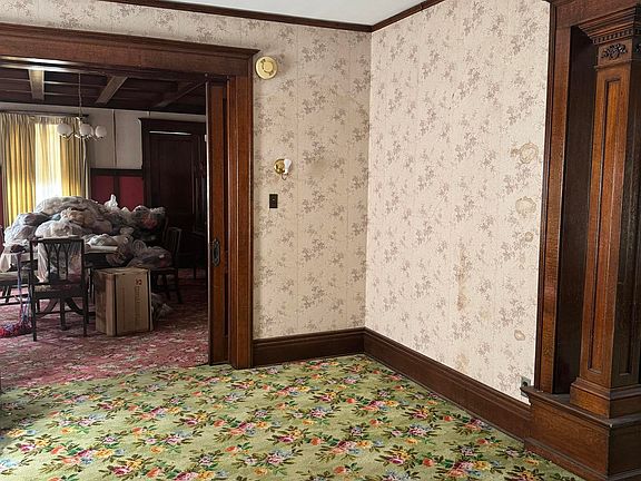 Attention Investors! Spacious 4 bedroom home with basement and finished attic area. The original woodwork is still in good condition. Welcoming foyer entry. Formal dining room has original wood pocket doors and beautiful woodwork ceiling. Kitchen has island and old school built ins. Beyond the kitchen is a serving area. Driveway goes through to alley making easy access. Nice sized front porch. Newer 60 year roof and newer furnace. Dining room table and chairs can stay. This would be a great fall project! Sq footage is not guaranteed or warranted.