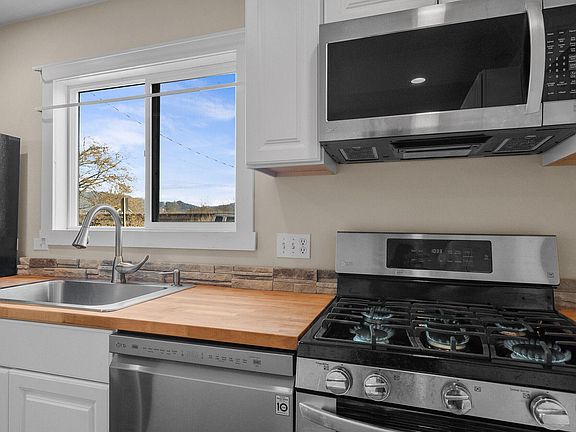 County living just minutes from schools and downtown. This charming remodeled home has an open floor plan, new stainless appl. including gas range. Solid wood doors thru-out, LVT, Laminate and tile flooring + forced air heating. Extra room off mast. could be converted in 2nd bath, also bonus room/4th bedroom thru breezeway. Lot is just under 1/2 acre w/beautiful fenced yard, fire pit, dog Kennel & garage w/shop or storage area. Beautiful exterior finishes and covered front porch, covered RV parking and accessible attic for storage. Home is across from some of the best fishing on the Trask River. A must see.