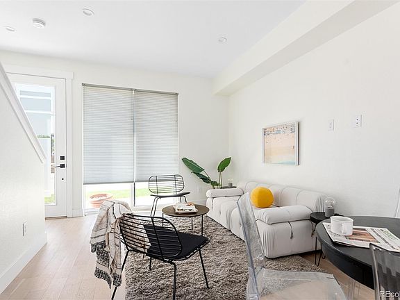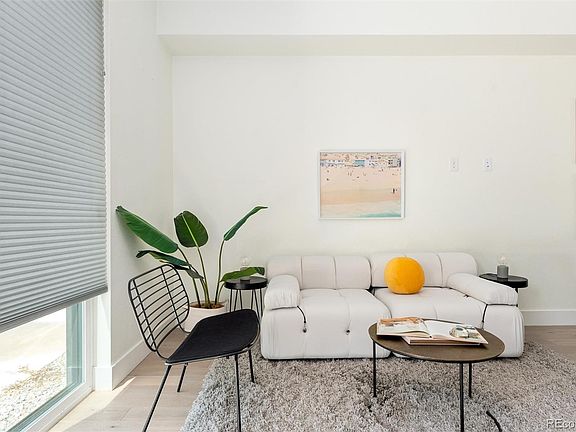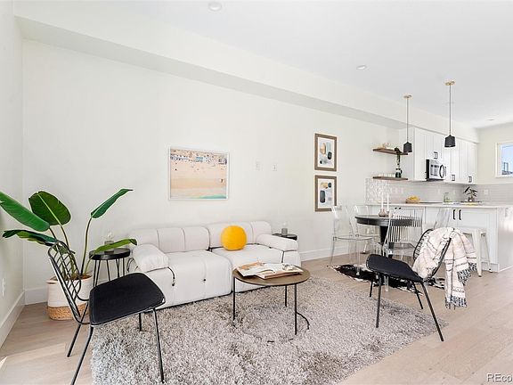 Discover contemporary urban living in this stylish Sunnyside residence, only blocks away from some of Denver’s favorite restaurants and parks. Upon entering, you are greeted by an open concept layout that maximizes the sense of space. Crisp white walls and sliding glass doors help accentuate the bright and airy feel of the home. Culinary enthusiasts will appreciate the farmhouse sink and stainless steel appliances in the kitchen, which blend seamlessly with the sleek cabinetry, floating wood shelves, black hardware, and quartz countertops. The main floor powder bathroom complements the modern aesthetic found throughout with a black shiplap wall and elegant fixtures. As you retreat upstairs, the vaulted ceilings and skylight elevate the atmosphere, allowing natural light to fill the rooms. The property boasts two generously sized bedrooms, each offering comfort and privacy, making it a great space to house guests. The primary bedroom is complete with a Romeo and Juliet balcony, barn door, and top down-bottom up shades. The upstairs bathroom has a striking aesthetic with black and white tile, beautiful quartz, and a glass shower with white subway tile. A stackable washer/dryer can be found in the hallway for your convenience. To ensure you always have a place to park, located out the back door, is a dedicated parking space for the unit. With quick access to the freeway, whether you are commuting, exploring, or traveling to the mountains, you are able to do so with little effort.