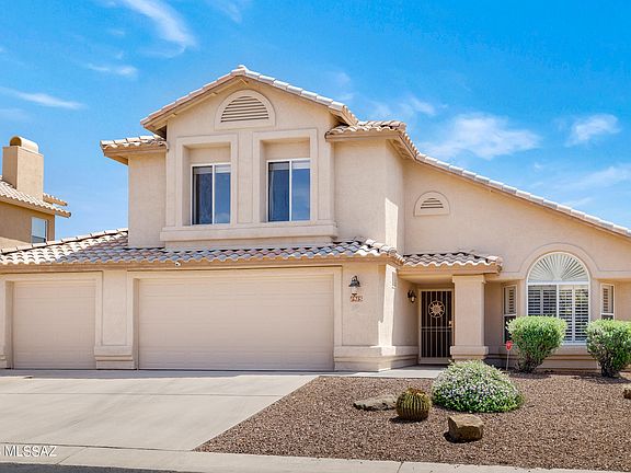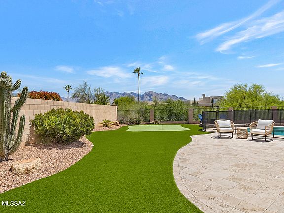 Beautiful, rare, spacious 5 bedroom, 3 full bath home with 3 car garage, pool, with spectacular Catalina Mountain views! Spacious layout with vaulted ceilings in the living and dining areas. Natural light throughout. Open kitchen boasts stainless appliances, granite countertops, custom tile backsplash, pantry closet and breakfast bar, all open to the family room. Upstairs primary suite features private balcony with commanding mountain and city light views, as does the large attached private bathroom with garden tub and walk in shower. Lower level large bedroom with door to private patio and easy access to first floor full bath would make excellent in-law accomodations, or office space, while upstairs 3 additional guest bedrooms are serviced by a third full guest bathroom. Huge, beautiful outdoor space in the backyard with a covered patio, large pool, diving board, upgraded turf, new putting green and travertine tile patio. East facing .23 acre lot backs up to open space creating a private retreat. Three car garage, recently updated downstairs HVAC and recently replaced water heater. Located in coveted Canada Hills Villages in Oro Valley. Beautiful neighborhood with winding streets, lush golf course vistas, all close to award winning schools, fine dining and myriad shopping opportunities. Hurry over to see this terrific home on hard to find East facing lot.
