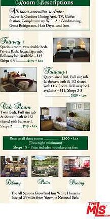 The White House. For sale at Auction. Auction will be held at the All Seasons Groveland Inn located at 18656 Main Street (Highway 120), Groveland, on Thursday 08/20/2015 at 1:00 pm. $50,000.00 Cashier check is required to bid. Brokers must register clients in advance of sale. Final and highest bid is subject to Sellers acceptance. See attached documents and marketing package. *23 Miles from Yosemite National Park *~ Mile from Main St. Restaurant and Shops *WiFi, TV, In-Room Coffee *Guest refrigerator, Guest Patio, Reading Loft *Championship Golf Course, Swimming *Tennis,Equestrian Center, Marina *Country Club, Pine Mountain Airport Access *Pine Mountain Lake. *Boat rentals, golf, tennis, swimming, hiking, riding