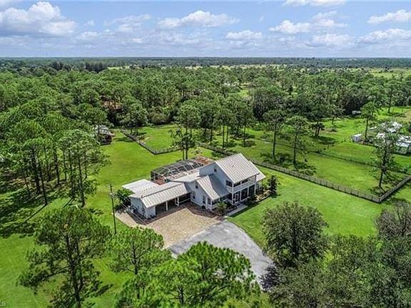 Gorgeous Pool Home with Guest House on 5.80 Acres in North Fort Myers! Peaceful surroundings and mature oak trees greet you as you drive up to this beautiful oasis. This three story well built home has 5 bedroom 4.5 baths (main house) and over 4500 sqft. Sip your morning coffee from your private master bedroom porch and enjoy the peace and quiet. This home features a beautiful kitchen with island, stainless steel appliances, walk in pantry, tray ceilings, two master suites, screened in porches, oversized lanai with pool spa, brick pavers, large carport with extra storage area and much more. Your guests will never want to leave their private guest house that has a bedroom, living room, kitchen, and bathroom. The work shop area has its own bathroom and the barn has 2- 10 ft garage doors and is perfect for all your storage needs. Property is zoned Ag-2 and is great for the animal enthusiast. Watch the sunset on your gazebo overlooking your pond. The fenced in property has mature trees, fire pit, separate pasture area, pond, gazebo, and barn. This house has everything you need and the outdoor space you have always wanted. Close to I-75, shopping, restaurants, churches and schools.
