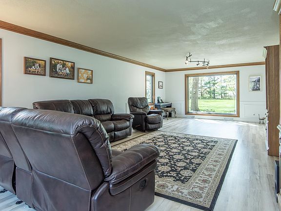 Amazing spacious 5 bedroom 3 bath country home 12 minutes from Little Falls on 5+ Acres with extra garage, circle driveway, picturesque setting & quality construction featuring custom woodwork, 2 fireplaces & generous room sizes! New Ac/furnace less than 8 years old, natural gas with electric plenum. Brand new Anderson windows throughout! Some new LVP flooring, kitchen ceramic tile, chimney tops redone, water softener and heater new 5 years ago, newer well pump, newer appliances & more!! Central Vac works throughout (except office port), new septic mound in 2013, both garages are insulated - detached 32x36 garage with bonus loft for storage or future living space has old propane heater (not currently used/working). Playground & chicken coop negotiable!