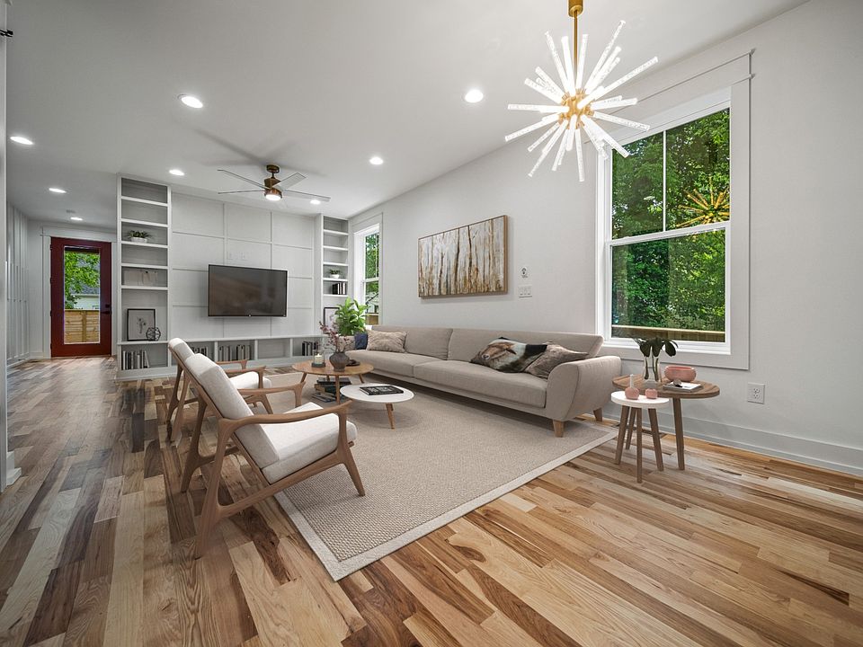 Exquisite contemporary new build home with a large open floor plan, 4 beds, 3 full baths, custom trim detailing with a beautiful kitchen showcasing a marble waterfall island. Unique living room detail including built-in bookshelves outlining the space. Hardwood floors and tile throughout with custom light fixtures. Master bedroom on the second floor with stunning tile, double vanity, and a glass walk-in double shower. All closets with built in shelving. Private balcony off of the second floor hallway. Privacy fence with spacious backyard. Shared driveway with a one car garage and additional parking. A mile from both Metrocenter and Germantown; two miles from Downtown. A convenient location to all parts of the city; unmatched home! IT IS A MUST SEE!