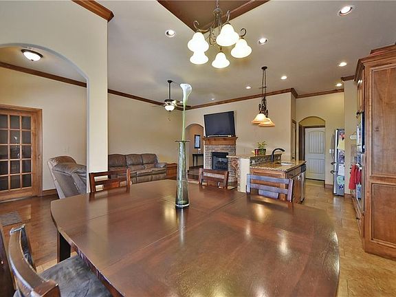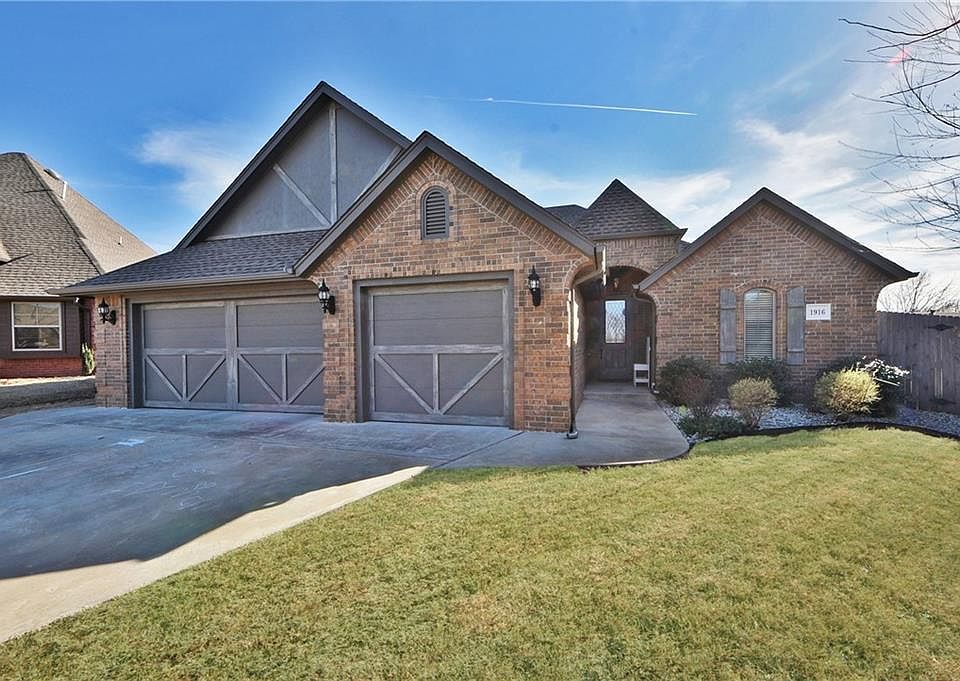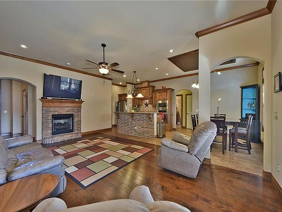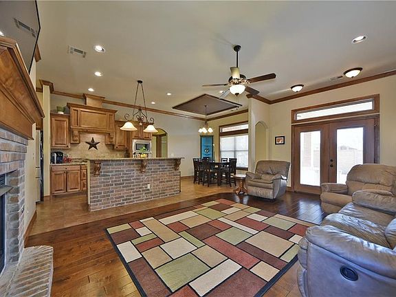 Tucked away on a third of an acre cul-de-sac lot, this three bedroom two bathroom open floorplan home in The Lakes At Bridgewater is the perfect oasis in the middle of town! Beautiful wood floors run from the entry into the living room, and continue into the study. The open kitchen-club area has a center island with breakfast bar and granite counter tops, stone backsplash, stainless steel appliances and dining area. The master bedroom is nicely sized with tray ceiling, access to study and master bathroom. The two spare bedrooms are a great size with access to a full hall bathroom. Large utility room has granite counter tops, a sink, and loads of storage. Oversized three car garage with professional grade flooring and above ground storm shelter. Out back is a covered patio overlooking the huge backyard and swing set. The gated neighborhood has lit walking trails and ponds. Come see this home today!