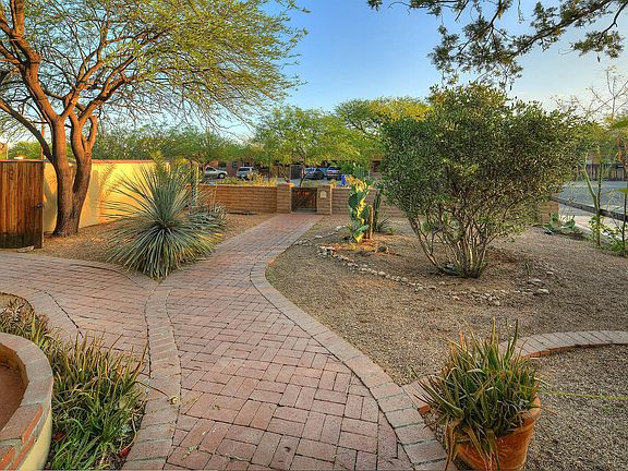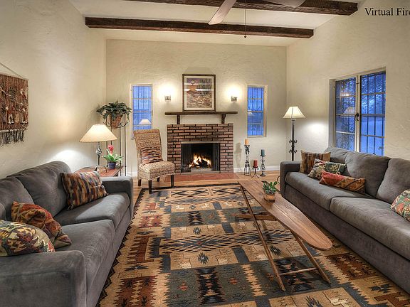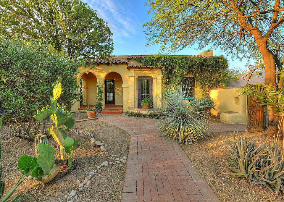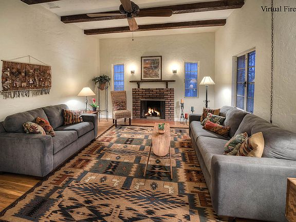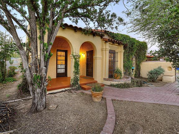 Charming, quintessential 1939 Spanish Colonial in desirable Sam Hughes with original restored oak floors and christal doorknobs throughout, beamed ceiling in living room and arched windows in large side entry/ laundry room. Open central kitchen dining area with new cocountertops, refrigerator and oven /stove. Flexible floor plan can be used as a 3 bedroom with studio or as a 2 bedroom with office and den or rent out the front 2 bedrooms and live in the back rooms. Full basement and cute outdoor shed provide ample storage. Plenty off-street (game day!) parking and a big covered patio in walled back yard with mature landscaping. This historic gem has newer sewer lines, high SEER rooftop AC/ heating unit, two water harvesting tanks, owned solar electric and water heating panels for lower ut