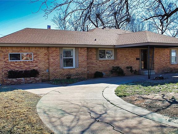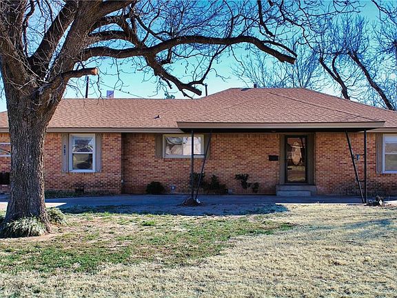Check out this charming home on the edge of Mangum! This brick home has a circle drive, mature trees and pull through carport. Upon entering this home you will see the ample storage space throughout along with spacious rooms. The large kitchen has an island and built in cabinets. The large living area has a storage closet along with a wet bar and sliding door to the back yard. Two bedrooms share a full bathroom on the south side of the home while an office (or formal dining area), half bath, and third bedroom are on the north side. The back yard has large pecan trees, cellar, storage building, and newer fence. Home has newer roof, vinyl double pane insulated windows, and central heat and air.
