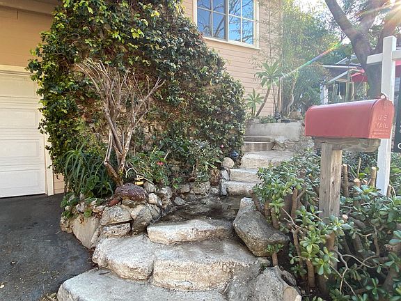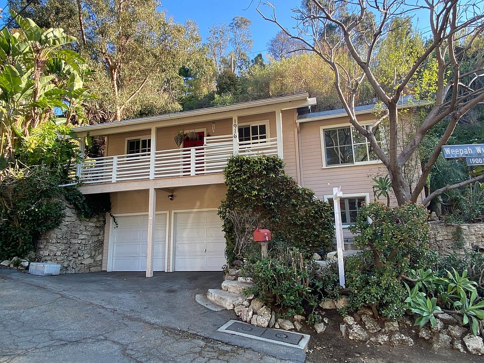 FOR LEASE. Cozy Laurel Canyon bungalow retreat offers 2 bedrooms and one bath situated above the street with partial canyon view. Large kitchen with red marble countertops and vintage stove. Living area and step down den with decorative heated fireplace. Dining room with built-in cabinets and French doors leading to quaint brick and stone patio built into the hillside. Ground floor two car garage with double apron parking available and small bonus room that would make a great home office. House sits on top of garage with entrance on 2nd level. New mini-split HVAC unit. Washer and dryer hookups in garage. Great Hollywood Hills location with natural setting that feels out of the city, but easy access to the Valley and Westside. Monthly rent $4200, Sec Dep $8400, all utilities paid by tenant.