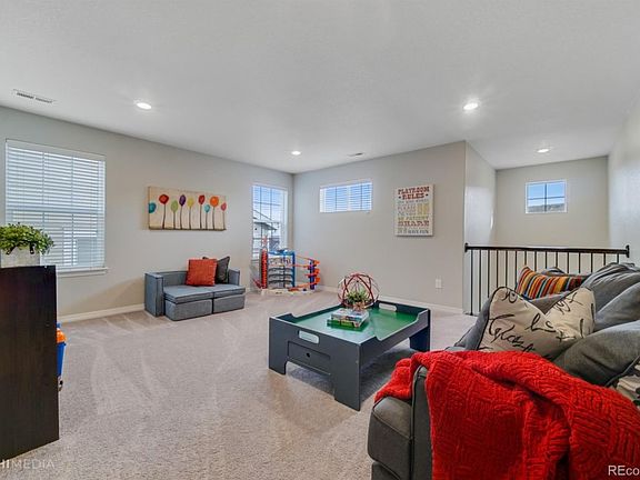 This home has all the current finishes of a new build without the added expense of landscaping and window treatments. Enter onto dark plank style floors surrounded by newly painted gray walls. Fun lighting throughout this home. Office is the first thing you?ll visit on this home tour. Lots of southern exposure give great light for office work. Next is the formal dining room or could be flex space for a 2nd office, living room or play room potential. Butlers pantry is the next stop with white cabinets, gray granite, and large pantry closet. The kitchen continues with a large island, SS appliances and this opens into the breakfast nook and large great room... Wide open for entertaining. Upstairs leads to a large loft area ideal for gaming, homework or toy area or could be easily finished into a rare 5th bedroom on the 2nd floor. Pass the upper level laundry room to the homeowner's quarters fit with a large bedroom, high ceilings, spa-like bathroom decked out in grays and whites. Head down the hall to 3 spacious secondary bedrooms, a hall bath as well as a Jack N Jill set up between two of the rooms. Lots of space to spread out!! Basement has a unique finish as the homeowners hung drapes and laid carpet to create another play area though it is not included in the "finished" square feet. An adorable playhouse is part of the sale with this home. The back yard features a wonderful covered patio and room for your favorite dog or child to run and play. Leyden Rock is a classic planned community with tons of trails, a pool and clubhouse, and excellent rated schools! Discover why this is the perfect place to call HOME!