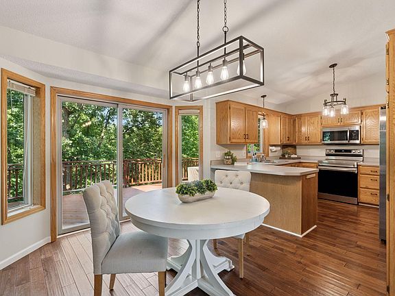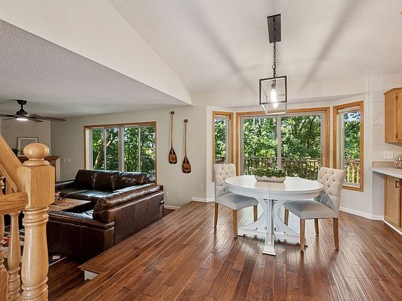 This beautiful, modified two-story home offers the ideal combination of peaceful waterfront living and convenient access to everything Elk River has to offer. Situated on a quiet cul-de-sac, the property provides privacy, natural beauty, and a prime location. From the west-facing deck, take in breathtaking sunset views over the water, or enjoy them from your private dock. Spend warm summer days on the water and transition effortlessly into winter with your own backyard pond hockey setup. Inside, the open floor plan features vaulted ceilings, expansive windows, and abundant natural light. Newly installed hardwood floors flow throughout the home, complemented by a new roof, gutters, water heater, and complete HVAC system for peace of mind and year-round comfort. The finished walk-out lower level offers a spacious recreation room and a fourth bedroom, currently being used as a home gym, opening directly to the backyard oasis. The newly constructed storage shed accommodates all of your seasonal and outdoor gear and includes French drains for proper drainage. This home has it all!