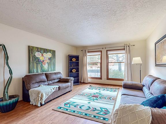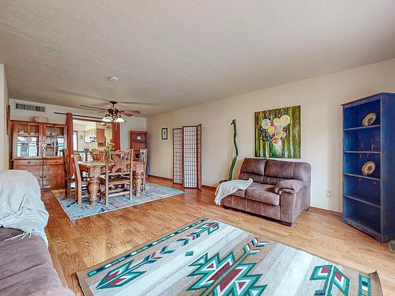 Nestled in the desirable Kachina Hills neighborhood at the base of the majestic Sandia Mountains, this charming home offers breathtaking views, fiery sunsets, and easy access to open space with parks, walking, hiking, and biking trails. Situated on a spacious .25-acre lot, the home features a thoughtfully designed 2013 sq. ft. floorplan with 2 living areas, a formal dining room, an owner's suite, and 2 additional bedrooms with a full bath. Elegant, engineered hardwood flooring enhances the living room, dining room, and primary bedroom. The inviting family room boasts a custom stone gas log fireplace, tongue-and-groove ceiling, built-in cabinetry and shelving, and access to the backyard patio. The well-appointed kitchen includes a garden window , ample countertops and cabinets...See More