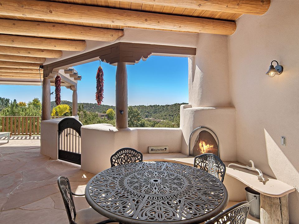 Nestled in the colorful foothills above Santa Fe, this Cerros Colorados property offers the ultimate Santa Fe lifestyle with gracious living and an exceptional location. The home features a comfortable and chic living room with a central fireplace, and windows and French-doors that feature sweeping views of the foothills. The open floorplan is ideal for entertaining, with excellent flow from the living room to the adjacent dining room and den. The well-appointed kitchen opens to both the dining room and outdoor portal for ease of extended outdoor living. The generous primary suite features a fireplace, reading nook which opens to the outdoor portal, and a luxurious en-suite bath that includes dual oversized walk-in closets, a jetted soaking tub with views of the hillside, and a walk-in shower. Two bedrooms with adjacent bathrooms are privately located away from the primary suite. The elegant finishes of the home include wood floors, vigas, granite kitchen counters, and diamond plaster walls in the living areas. The wrap-around portal captures views of Picacho Peak, and is the perfect place to unwind by the kiva fireplace. This special property is located 10 minutes from Santa Fe's historic Plaza, and is within minutes to miles of nearby trail systems. Here is a true dream for nature lovers, entertainers, or those wishing to enjoy the peace and tranquility of Santa Fe's outdoors. A new Gaco silicone roof was installed in 2021, and the house was re-stuccoed in 2023. This property is a true gem, and is not to be missed!