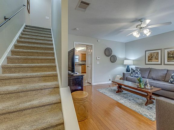 Beautiful Townhome in Barnes Crossing and Well Maintained! New wood top on kitchen island, open to additional seating, walk in pantry, recently painted, updated and painted bathroom cabinetry, 2 bedroom suites upstairs with private living on each side, laundry room upstairs that services both bedrooms, mulitple closets, hardwood down and carpert upstairs private fenced patio that opens to common green space, convenient and great location. REFRIGERATOR REMAINS. Key Holder behind front door and White Drapes upstairs DO NOT REMAIN.