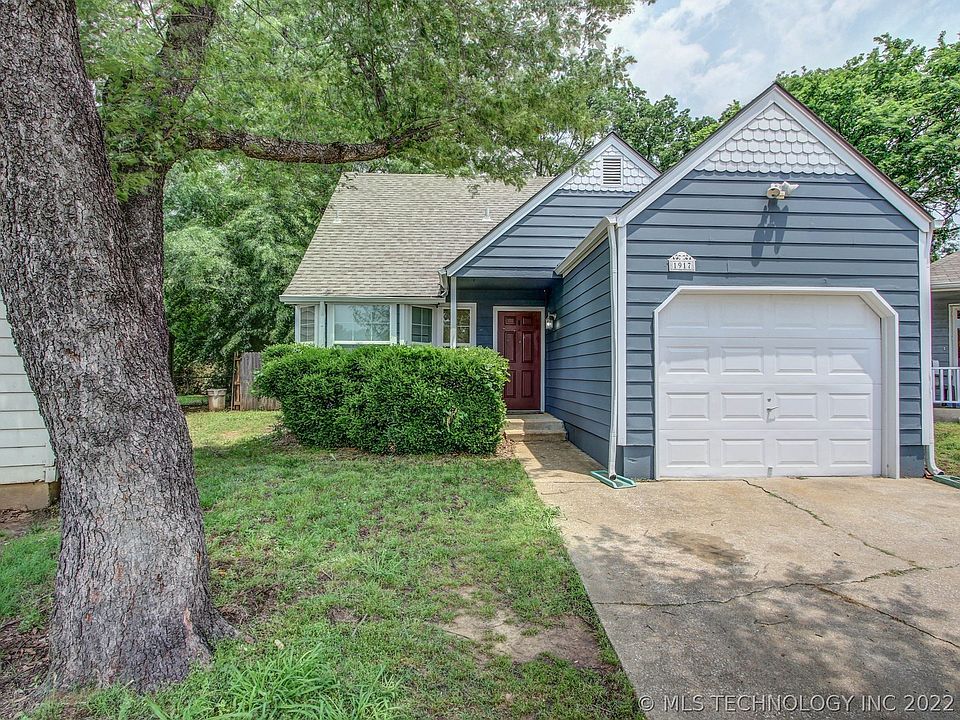 Cute Victorian style home on cul-de-sac. Master bedroom down and 2 up with full bath. Living area with brick fireplace. Slider opens to deck and treed backyard. Jenks Schools. Ready for your interior paint and updates. Near Page Belcher Golf Course and Town and Country School.