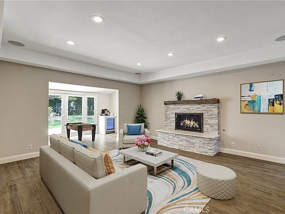 Distinctive single story sprawling 4-bedroom single story home situated at the end of a cul-de-sac ~ Nestled on top of the cul de sac in central Yorba Linda, this home has so much to offer! Stunning curb appeal with extensive hardscape and planting areas ~ Leaded door entry leads to a wide open floorplan which is contemporary in design ~ Massive formal living room and formal dining with bay window ~ Family room with fireplace opens to a unique game room which is perfect for entertaining ~ Remodeled kitchen features white cabinetry, warming drawer, breakfast bar, Viking double oven, China cabinetry, quartz counters and casual eating area ~ Enormous primary suite with recessed lighting, fireplace, views to rear yard plus a huge primary bathroom with separate tub, shower, dual sink, and walk in closet ~ 3 additional bedrooms are ample in size and share 2 remodeled hallway bathrooms ~ Wide plank wood style flooring, carpeting, Plantation shutters, ceiling fans, dual paned windows, upgraded baseboards and neutral paint make this an exceptionally nice home ~ Magnificent 21,900 sqft lot with stunning wrap around covered patios and walkways ~ Lots of garden areas and lawn, shade tree and lots of fruit trees, including avocado, pomegranate, grapefruit, orange, lime, peach, macadamia and a artichoke plant ~ WOW…that's not all! The side yard is perfect for an RV or a sports court! Lower-level plot of land is a great space for gardening! Don’t miss the opportunity to own this exceptional home!