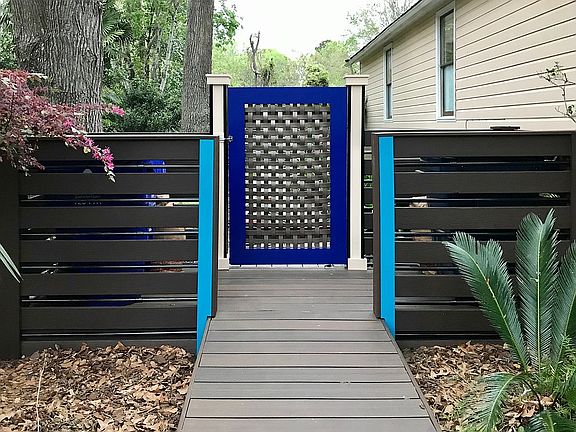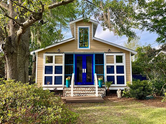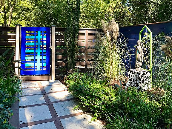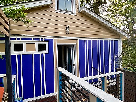 One of a kind architect-designed “modern barn” style home built in 1996. Full interior renovation and addition of second full bath using professional interior designer completed in 2014. Backyard deck, under-deck storage, and side yard boardwalk added in 2019. Exterior renovation including new paint, fencing, and windows completed in 2022. New central HVAC package unit and ductwork installed in 2022. A whole-house surge protection system and electric car charging port were added in 2023. Site is shaded and lush, professionally designed and landscaped. Expansive open common area plan features 16’ high vaulted ceiling and clerestory supported by exposed truss beams and steel turnbuckle tension cabling over 23’ x 23’ living, dining, and kitchen area. Modern kitchen features custom built sturdy cabinetry with high-pressure laminate doors, solid-surface terrazzo countertops, Bosch dishwasher, and a custom ceramic tile mosaic over the stainless steel sink. 6’w x 8’h double glass doors open to a 12’ x 23’ semi-private porch with continued vaulted ceiling, beams, and clerestory. Four sliding wood “warehouse” doors may be closed to protect the porch from inclement weather. Bedrooms are larger than average with generous closet space. Stacked washer/dryer connection is in main bathroom. A brightly lit narrow loft within the rearmost section of the clerestory offers access to attic storage and bonus space for an office or small gym.
