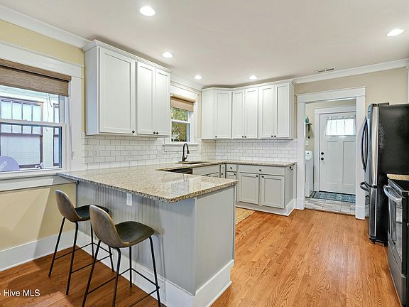 A beautifully renovated cottage located in the sought-after Carolina Place/Ardmore neighborhood. This charming 3-bedroom, 2-bathroom home features an open floor plan and modern updates throughout, blending the warmth of a classic craftsman style home with the conveniences of contemporary living. Updated kitchen with custom cabinetry, sleek countertops, and modern appliances - perfect for cooking and entertaining. The open floor plan flows seamlessly from the kitchen to the living and dining areas. New windows with custom shades, adding both energy efficiency and elegance. Beautiful hardwood floors throughout the home. Updated roof, HVAC system, and water heater - all installed for peace of mind and comfort. Expansive front porch with ample space for relaxing and enjoying the outdoors. Backyard deck with a custom rollout shade for year-round enjoyment. Storage shed in the backyard - perfect for additional storage.. Permits for the remodel through New Hanover County, ensuring quality updates and compliance with local standards. Off-street parking for convenience and ease. This meticulously renovated home is move-in ready, offering a perfect blend of modern updates and charming character. Located in a desirable area with easy access to local shops, restaurants, parks, and schools, this cottage is perfect for those looking for a cozy retreat in the heart of one of Wilmington's most vibrant neighborhoods.