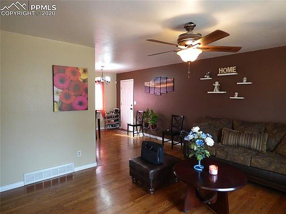 Move in ready. Take a look at this well kept home. It has 2 bedrooms upstairs which has hardwood floors under the carpet. The kitchen is on the main level and has tiled flooring. Also on the main level is the dining room and living room which have hardwood floors. Downstairs is the family room with new laminate floors and the third bedroom. This home has a large back yard with views of pikes peak. The washer and dryer stays with the home as well as the kitchen appliances.