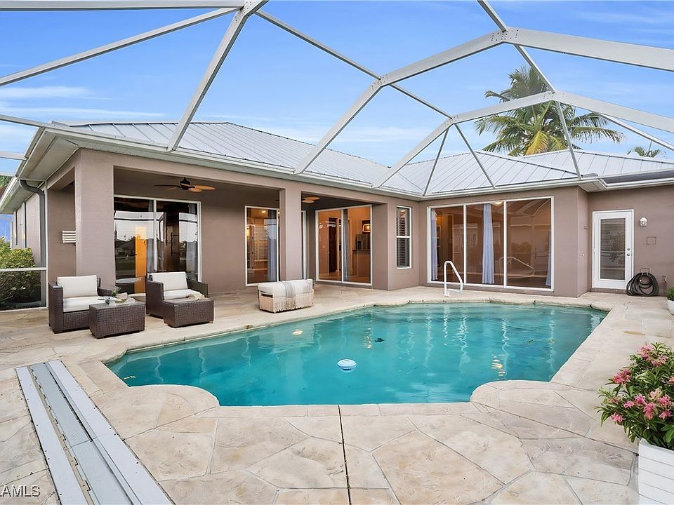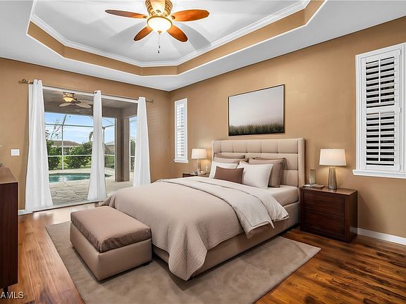 Discover this stunning four-bedroom plus office, three-bathroom pool home in SW Cape Coral. Spanning 2,118 sq. ft., this property is situated on a FRESHWATER CANAL and neighbors the Golf course at Palmetto Pines Country Club! The expansive family home features plantation shutters, tray ceilings, pocket doors, ceiling fans, and solar-tinted windows. The split floor plan ensures maximum privacy for all bedrooms.