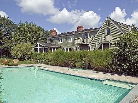 This large and gracious country property evokes the essence of a time honed Nantucket style cape and sea breezes. Set amidst emerald lawns down a tree lined allee, a circular drive leads to a slate walkway and rocking chair front porch. Through its divided light entry door, a generous foyer has flanking formal dining and living rooms accented by dental molding and custom mill work. Open exterior views and random width hard pine floors unify the main living level. Truly the heart of the home, a magnificent open kitchen features a massive center island, cabinetry a mix of warm honeyed wood and painted coastal verdigris, farmhouse porcelain sink, induction cooktop, upscale appliances and granite counters. An oversized brick fireplace and full wall of french doors in the adjoining breakfast room bridge these spaces to the family room, enjoying its own brick fireplace and access to the enclosed porch and rear deck with navy and white striped awning. A more welcoming environment could not be imagined. Off the kitchen is a back hall with pantry, powder room, garage entry and private stair to the master bedroom suite; a study in serenity with a sitting room, abundant walk in closet storage, spacious bedroom and bathroom with a showpiece oversized walk in marble tiled shower with built in bench, rain shower head and multiple sprayer options. Four more well appointed bedrooms share a large hall bath. A second floor laundry room is the ultimate in ease. Its rear yard outlined with split rail fencing is bright and sunny and offers a rectangular inground pool and spa. Immaculate, treasured and inviting, this property is sure to beckon Home Sweet Home.