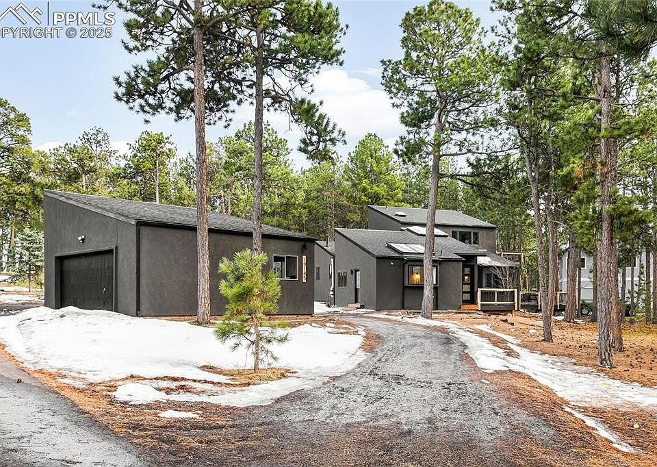 Embrace mid-century modern elegance in this fully renovated masterpiece in Woodmoor, where no expense was spared in creating a timeless sanctuary. Set on nearly an acre of forested bliss, this home backs to the ninth fairway of The Country Club at Woodmoor Golf Course, allowing direct access from the property. Designed for an indoor-outdoor lifestyle, the vaulted ceilings, expansive new windows and skylights flood the home with natural light, while mid-century influences turn every window into a frame for living art. Thoughtful updates include custom lighting, new doors and hardware, terrazzo tile and stone countertops. Designer details come forth in a chic kitchen and living space. Retreat to a primary suite with access to a private balcony or enjoy the rejuvenation of a hot tub surrounded by tall pines. Moments from The Country Club at Woodmoor, from the walking path adjoining the property, enjoy golf, tennis, sparkling outdoor and indoor pools, private fishing, sledding hill, and miles of trails. Architectural plans for an expansive addition make this home a rare blend of luxury and future potential.