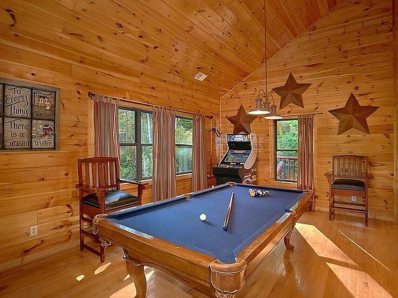 Four Seasons features a fully furnished screened in porch with outdoor fireplace, sitting area and dining area! Watch HD movies on the 60" plasma TV with blu-ray and free movies on Netflix or enjoy the pool table and arcade machine with 130 classic games! Do not miss this exceptional cabin as the seasons change.