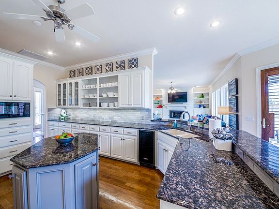 - INT/EXT FEATURES: Garage Door Opener, Fireplace, Gas Logs, Slab, Security System, Patio, Lawn Sprinkler System, Storm Shelter