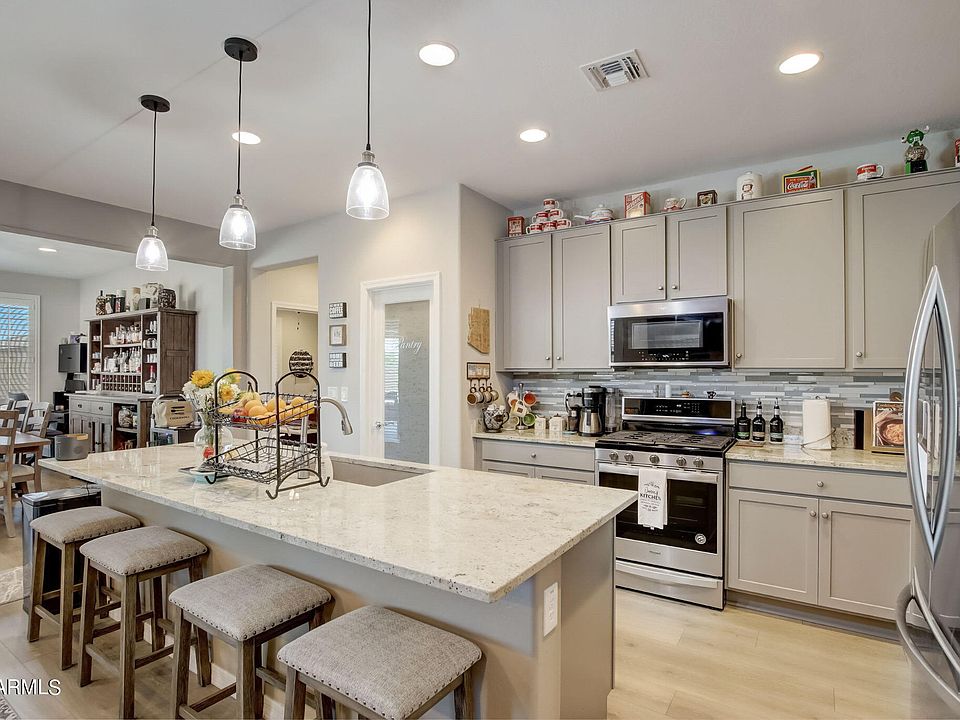 Amazing 3-bedroom split floor plan den/mother in-law suite is perfect for out of town guest that gives privacy, separate end of the home. Home features a soothing interior color palette, beautiful, upgraded tile floors, ceiling fans, upgraded lighting and plantation shutters throughout. Gourmets eat-in-kitchen along with granite countertops, abundance of 42inch kitchen cabinetry and large island equipped with a sweet walk in-pantry. Master suite features dual sinks, garden tub and separate shower, large walk-in closet. Soak up the Arizona Sun in this large relaxing backyard oasis next to the pool which is heated if one wants for winter months. Offers your own practice putting green. Garage comes with a four-foot extension which makes the tandem side 37'' deep (Boat Deep). The garage is also insulated along Split AC in garage as well and a 50amp plug in garage for a level 2 car charger (EV Charger. The side yard comes with RV gate and home also is equipped with sunscreens on all windows, rain gutters and a 40amp outlet in backyard for a spa. No need to wait on a new build, this home feels and looks like a spec home loaded with so many upgrades you will love!
