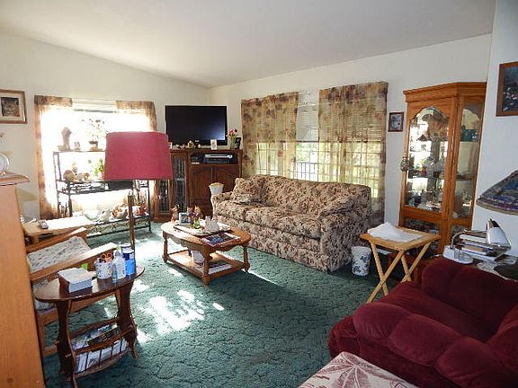Spacious triple-wide mfg. home on nearly 3 perimeter fenced acres. New metal roof, new covered deck, garden areas, oversized detached garage, storage sheds, wooded area, and lovely landscaping. 3 bedrooms 2 baths, living room and separate family room, & spacious kitchen with center island. With a little work, this will shine once again.