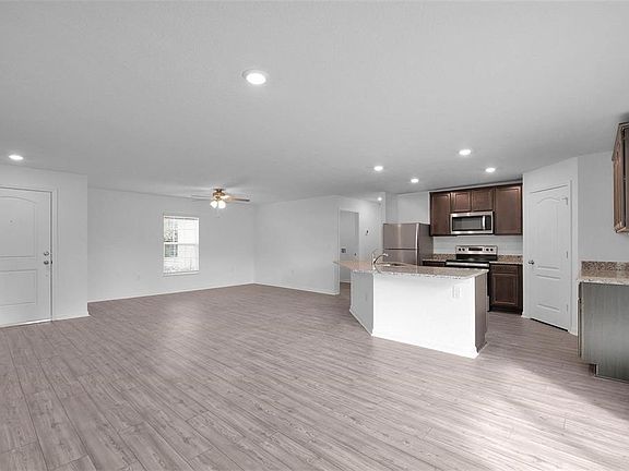Attached garageGranite countertopsOpen floor planCovered front entrywayModern kitchenSpacious great roomStainless steel appliances