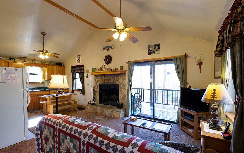 This ideal combinations of easy-care space and great views will win your heart! Graceful tall trees hold your hammock, shade the gently sloping yard, and give your home seclusion and privacy. Open kitchen just steps from the warm fireplace and sliding doors to deck. Guests will adore the spacious bedrooms and storage, while Fido romps in the fenced dog run. Abundant kitchen cabines and quality finishes will please your resident chef; classic wood accents, closet doors, and trims give the home a well-mannered rustic touch. Move-in ready, so there's not need to fuss; just unpack, settle in, and get ready for fun! Furnishings negotiable!