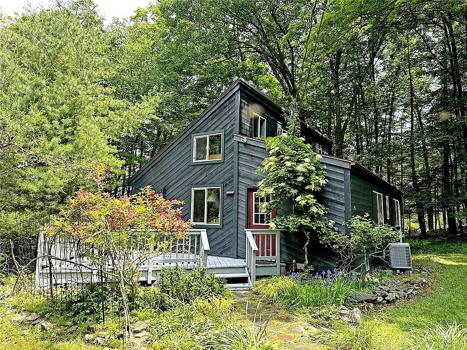 Seller has accepted an offer. We will continue to show. CTS. This Woodstock retreat, w/ seasonal mountain views, was designed for reveling in nature. It's Post Modern twist lends an eye to simplicity and grace, featuring tons of windows, lots of wood, ample spaces, and an aim to bring the-outside-in at every turn. Yes, you are surrounded by magical woods and you will also have a huge open lawn. The contemporary vibe includes: soaring cathedral ceilings, exposed wood beams, well-crafted exposed wood ceilings, an open flow, clear-story windows, and a surprise sleeping loft (or office) for additional living space. Here's a chance to write that novel while gazing out at the dog running around the lawn from your lofty perch, or throw a futon upstairs to catch overflow guests visiting from the city. There are 2 adorable first floor bedrooms, both with exposed wood ceilings and large picture windows, and they share an amble full bath between them. Set well back from one of Woodstock's most coveted and quiet country roads, this is a place to relax and relish life. The kitchen also has great access to the outside and is very functional and flexible. In the morning have a cup of coffee at a small cappuccino table by a picture window or, in the evening, chat through a large pass-thru window while your friends dine a few feet away in the great room. These living spaces were designed to create connectivity or provide privacy depending on your needs. The vaulted living area is a great place to entertain and watch 'the game' or step through the sliding glass doors onto a spacious angular wrap-round deck. The deck overlooks acres of untouched forest and open lawn and provides wonderful possibilities for reading a book, sharing a BBQ with friends, singing around a fire pit, or practicing a little yoga ... all while knowing that you are literally minutes to hiking, rock-hopping, music, Woodstock's great restaurants, and everything the Catskill Mountains have to offer. It's a 3 minute drive to Woodstock Village Green, yet you will feel 'alone in the country' and ready for al fresco dinners, a game of croquet, or a snuggle by the wood stove after a long day of skiing. These 3 acres feel like 5! Perfect in every way, or use it as a start to expand to a larger home. Due to its fantastic location on one of Woodstock's most desirable roads it will always be your sublime spot, hidden from the road.Think green, green, flowers, trees! The seller feels that a year-round mountain may be possible with a bit of selective cutting. A pleasure to show and see.