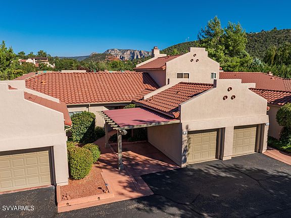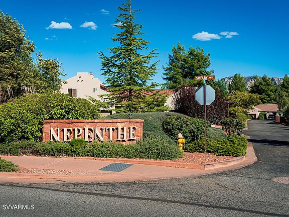 Nepenthe is a beautiful 35 acre patio home complex conveniently located in West Sedona. This lovely 2 bedroom, 1 bath unit has just been freshly painted, beautiful upgrades made to the kitchen & bathroom, new lighted ceiling fans in the living room & both bedrooms. Tile flooring throughout with carpet in the bedrooms, refrigerated air conditioning, natural gas hot water & heat, gas log fireplace in the living room, rear patio with a storage closet & a small fenced easy care back yard, on city sewer. Single car garage plus a carport, appliances included. Monthly HOA fee covers all exterior maintenance, including the roof, all common area landscaping, on site management, community swimming pool & year round hot tub. 30 day minimum for rentals. Virtual staging by Phoenix Virtual Tour.